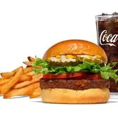 A vegan black bean quinoa burger patty served with lettuce, tomatoes, red onions, pickles and mustard. Includes seasoned fries along with your choice of a 20oz drink.