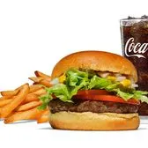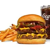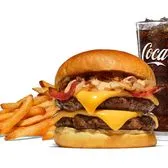 100% all-natural beef double meat hamburger with sliced cheddar, bacon, diced onions, pickles and BBQ sauce. Includes seasoned fries along with your choice of a 20oz drink.