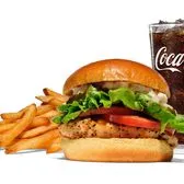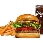 100% all-natural turkey patty served with lettuce, tomatoes, onions, pickles and mustard. Includes seasoned fries along with your choice of a 20oz drink.