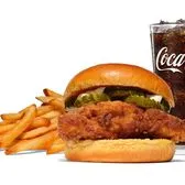 Breaded by hand, seasoned and fried to perfection. Served with pickles and mayo on a fresh baked bun with fries and a 20oz drink. Always gluten-free!