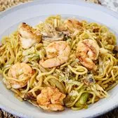 Japanese sautéed noodles with shrimp and mixed vegetables in a special sauce and sprinkled with sesame seeds.