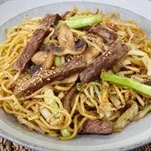 Japanese sautéed noodles with steak and mixed vegetables in a special sauce and sprinkled with sesame seeds.