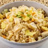 Grilled chicken, rice, egg and chopped vegetables and a combination of chili peppers, ginger and Sriracha sauce.