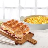 Serve our Take & Bake Slider Dinner any night of the week! This slider dinner includes your choice of one of our signature Take & Bake Slider Trays (choose from either original Ham & Swiss or savory Garlic Herb Turkey & Cheddar), as well as your choice of one of our frozen Heat & Serve Side Dishes. Serves 4.