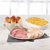 Serve our 2lb Slices Dinner any night of the week! This 2lb Slices Dinner includes 2lb of our signature Honey Baked Ham or Turkey Slices (choose from either Roasted or Smoked), as well as your choice of one of our frozen Heat & Serve Side Dishes and a 4-pack of King's Hawaiian Rolls.