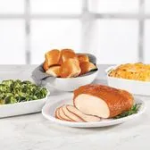 A complete meal your friends and family are sure to love! The Honey Baked Ham & Turkey Feasts includes a Bone-in Half Ham (8 lb.) and Turkey Breast (2.95 lb.) - both topped with our signature sweet & crunchy glaze. Meal also includes your choice of four of our frozen Heat & Serve Side Dishes. To ensure serving all of your guests, we recommend ordering 2 packages of only 2 different varieties.