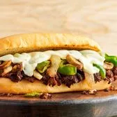 Shaved steak sauteed with onions, peppers and mushrooms topped with provolone cheese served on a toasted hoagie bun. Beef 920 cal | Chicken 1000 cal