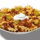 Ready to get loaded, Texas Style? Our seasoned waffle fries come topped with chili, cheese sauce, sour cream, bacon bits and jalapeños.