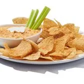 A creamy blend of shredded chicken, spicy Buffalo sauce and melted cheese topped with your choice of ranch of bleu cheese. Served with warm tortilla chips for dipping. 1370 cal