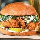 Crispy Fried Chicken, dusted with Nashville Hot Spices and topped with Cabbage Slaw, Mayo, Alabama Comeback Sauce & Pickles