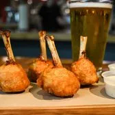 French-cut chicken drummies—brined, baked, then fried to crispy perfection. Tossed in buffalo sauce and served with your choice of HD Ranch or blue cheese for dipping. This item is gluten friendly. If you have an allergy, please let the kitchen know.