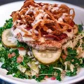 House Greens tossed with Apple Cider Vinaigrette, Tomato & Onion, topped with a Grilled Chicken Patty, White American Cheese, Steakhouse Bacon, Crispy Onions, Pickles, Chipotle Aioli & HD Ranch.