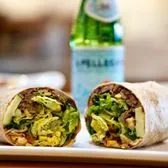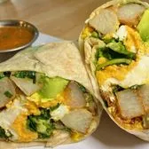 Eggs, Cheddar Cheese, Grilled Potatoes, Sauteed Spinach and Avocado wrapped in a flour tortilla served with a side of salsa.