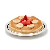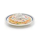 1 piece fluffy buttermilk pancake filled with festive rainbow sprinkles. Topped with cupcake icing & crowned with whipped topping.