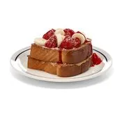 Two slices of bread dipped & griddled in new vanilla, cinnamon French toast batter & topped with strawberries & bananas.