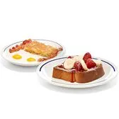 One slice of French toast, 2 eggs, 2 custom-cured hickory-smoked bacon strips or 2 pork sausage links & golden hash browns.