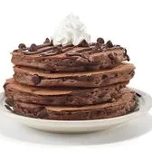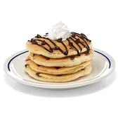 Four buttermilk pancakes filled with chocolate chips, topped with a drizzle of chocolate syrup & more chocolate chips.