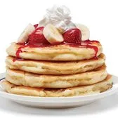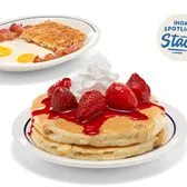 Choice of any 2 same-flavored pancakes, served with 2 eggs your way, 2 custom-cured hickory-smoked bacon strips or 2 pork sausage links & golden hash browns.