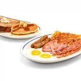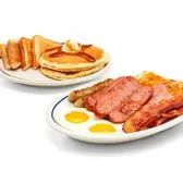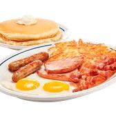 Two eggs* your way, two custom cured hickory-smoked bacon strips, two pork sausage links, two thick-cut pieces of ham, golden hash browns & two fluffy buttermilk pancakes.