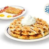 Try our new IHOP’s Spotlight Stack™ flavor! 2 buttermilk pancakes filled with cinnamon streusel and layered with cinnamon spread then topped with cream cheese icing, more streusel & whipped topping. Served with 2 bacon strips or 2 pork sausage links, 2 eggs* your way & hash browns.