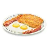 One egg* your way, 1 bacon strip, 1 pork sausage link, 1 thick-cut piece of ham, hash browns & 1 buttermilk pancake.