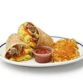 3 slices of hickory-smoked bacon, 3 pork sausage links, hash browns, scrambled eggs†, jack & cheddar cheeses, and hollandaise wrapped and griddled in a tortilla.