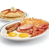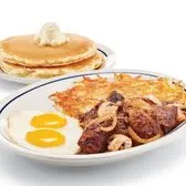 Two eggs* your way, 2 custom cured hickory-smoked bacon strips, 2 pork sausage links, 2 thick-cut pieces of ham, golden hash browns & 2 fluffy buttermilk pancakes.