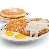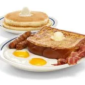 2 eggs*, 2 bacon strips, 2 pork sausage links, 2 buttermilk pancakes & 1 slice of our new Thick ‘N Fluffy French Toast.