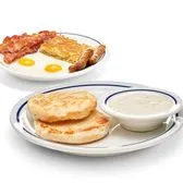 Warm & flaky buttermilk biscuit served with hearty gravy, 2 eggs*, 2 pork sausage links, 2 hickory-smoked bacon strips & hash browns. Gravy may contain pork.