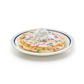1 Fluffy buttermilk pancake filled with festive rainbow sprinkles. Topped with cupcake icing & crowned with whipped topping.