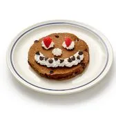 Choice of chocolate or buttermilk pancake filled with chocolate chips. Topped with whipped topping, a chocolate chip smile & fresh strawberry eyes.