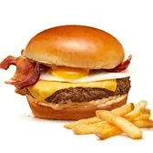 This may be how the west was won. Two onion rings, hickory-smoked bacon, American cheese, lettuce, tomato & tangy BBQ sauce.