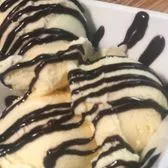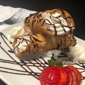 Two crispy Cannoli tubes stuffed with our delectable chocolate chip cream filling and topped with whipped cream and chocolate syrup.