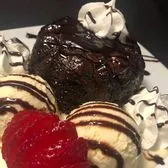 A scrumptious personal-sized chocolate cake filled with a warm molten center and served with a scoop of vanilla ice cream. Topped off with whipped cream.
