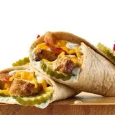 Grilled chicken, dill pickle chips, creamy dill spread, bacon strips, cheddar cheese, ranch in a wheat wrap.
