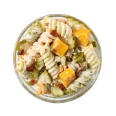 Rotini pasta tossed with dill pickles, bacon bits, and cheddar mixed with sour cream and homemade ranch dressing.