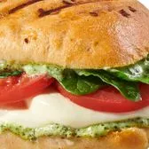 Fresh mozzarella, organic spinach, tomato, pesto aioli, herb focaccia. Served with chips (150-160cal) or baked chips (100 cal).