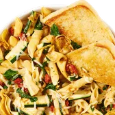 Penne pasta, roasted zucchini, fresco mix of roasted tomatoes, organic spinach, artichoke hearts, Asiago. Served with herb focaccia.