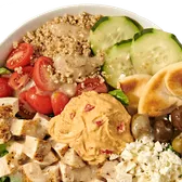 Organic quinoa, romaine lettuce, tomatoes, olives, hummus, cucumber, feta, toasted pita, and Greek dressing.