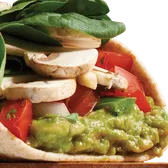 Mushrooms, organic spinach, Asiago, guacamole, pico de gallo, in a toasted organic wheat wrap. Served with salsa. Choice of one side: fresh fruit, steamed veggies, baked chips or blue corn chips. Choose a Full, Half, or Lighter Portion sandwich, or enjoy our Manager's Special - a Half sandwich served with your choice of soup, fruit, or Mac & Cheese.