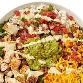 Romaine lettuce, rice, pico de gallo, roasted corn and black bean salad and guacamole, cheddar, jalapeño ranch dressing, Southwest spices.