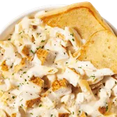 Penne pasta, Alfredo sauce, Asiago. Served with herb focaccia.