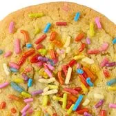 Freshly baked sugar cookie with multicolored sprinkles on top.