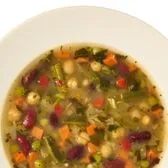 Packed with kidney beans, garbanzo beans, green beans, and an array of garden vegetables including onions, cabbage, tomatoes, bell peppers, and fresh spinach.