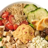100% antibiotic-free chicken breast, organic quinoa, romaine lettuce, tomatoes, olives, hummus, cucumber, feta, toasted pita, and Greek dressing.