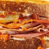 Three meats - salami, pepperoni, ham - with melted provolone, spicy piquillo pepper relish, mayo, on toasted sourdough. Served with chips (150-160 cal) or baked chips (110 cal) and a pickle (5 cal). Choose a Full or Half sandwich, or enjoy our Manager's Special - a Half sandwich served with your choice of soup, fruit, or Mac & Cheese.
