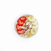Natural Gluten Free Oats, mixed with Almond Milk and chia seeds, topped with Bananas and Strawberries, Almonds and Raw Honey