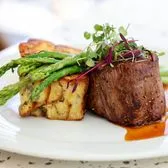 hand-cut tenderloin, 7 onion bread pudding, grilled asparagus, blackberry demi