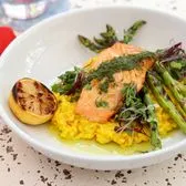 saffron risotto, pesto, roasted broccolini, grilled salmon