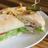 House brined & roasted turkey breast, Pederson’s all natural bacon, sliced avocado, lettuce, tomato, cucumber & choice of jalapeno remoulade or chipotle aioli. Served on warm buttered ciabatta bread.
